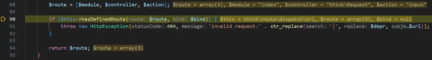 跟进check方法,盯住变量检测栏,可以看到这里是把我们的/换成|,url变为了index|think\request|input,后面还有很多处理,但是处理完之后还是不变: