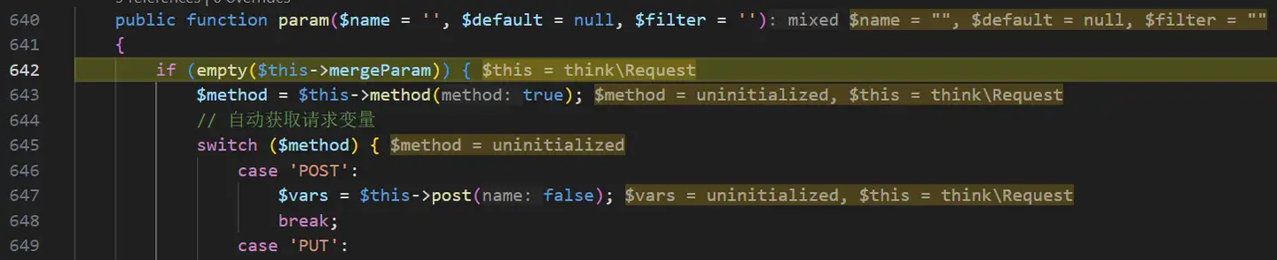 这是第二个关键点,由于我们的debug模式是true,所以进入到if语句,这里关键的地方就是调用了think\Request的param()方法,跟进: