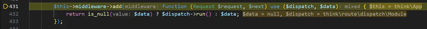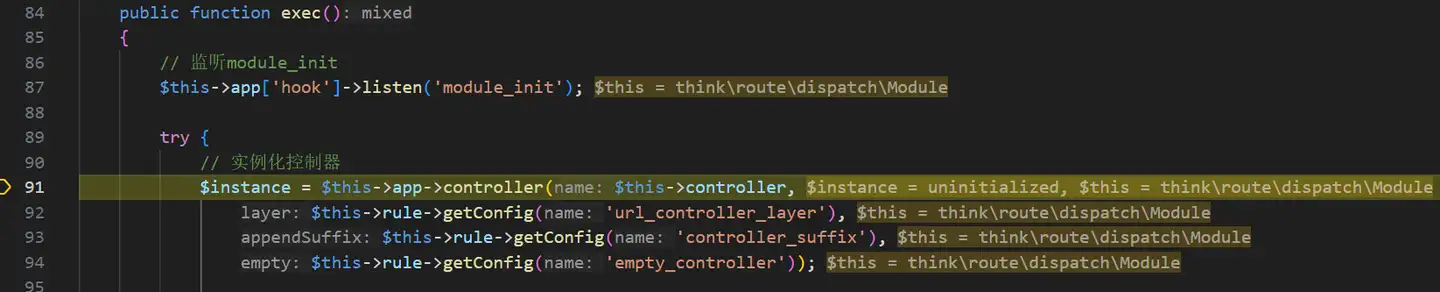 调用了dispatch的run方法,跟进其中的exec这个危险方法,这个方法的作用就是实例化了控制器think\request,并且通过反射机制获取了url中传入的我们需要调用的方法input,且利用param方法获得请求参数,即filter=system&data=dir,总的来说就是为rce做好了准备