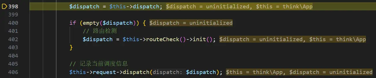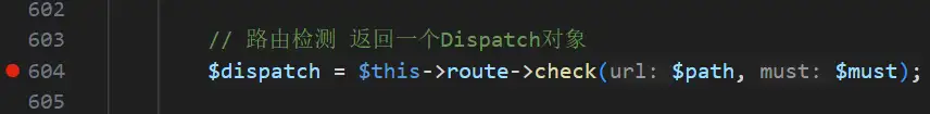 跟进routeCheck,直接看获取dispatch部分,可以看到这里两个参数,一个是我们输入的s后面的路径,另一个must用来表示未开启强制路由模式: