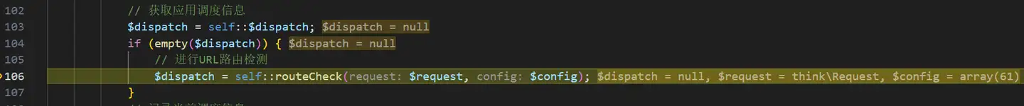 首先是经过$dispatch = self::routeCheck($request, $config)检查调用的路由