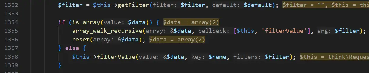 跟进filterValue,发现里面直接call_user_func了,func是filter,data是参数,实现rce