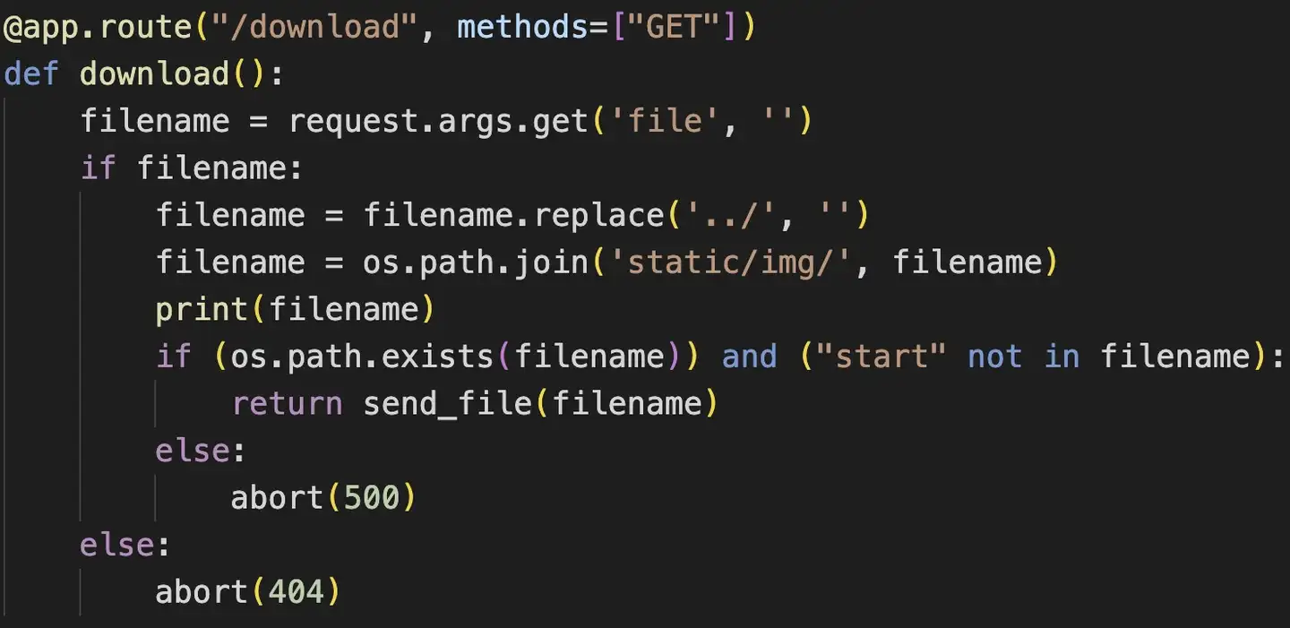 1 2 3 4 5 6 7 8 9 10 11 12 13 14 15 16 17 18 19 20 21 22 23 24 25 26 27 28 29 30 31 32 33 34 35 36 37 38 39 40 41 42 43 44 45 46 47 48 49 50 51 52 53 54 55 56 57 58 59 60 61 62 63 64 65 66 67 68 69 70 import os import re from flask import Flask, render_template, request, abort, send_file, session, render_template_string from config import secret_key app = Flask(__name__) app.secret_key = secret_key @app.route('/' ) def hello_world (): return render_template('index.html' ) @app.route("/cancanneed" , methods=["GET" ] ) def cancanneed (): all_filename = os.listdir('./static/img/' ) filename = request.args.get('file' , '' ) if filename: return render_template('img.html' , filename=filename, all_filename=all_filename) else : return f"{str (os.listdir('./static/img/' ))} <br> <a href=\"/cancanneed?file=1.jpg\">/cancanneed?file=1.jpg</a>" @app.route("/download" , methods=["GET" ] ) def download (): filename = request.args.get('file' , '' ) if filename: filename = filename.replace('../' , '' ) filename = os.path.join('static/img/' , filename) print (filename) if (os.path.exists(filename)) and ("start" not in filename): return send_file(filename) else : abort(500 ) else : abort(404 ) @app.route('/backdoor' , methods=["GET" ] ) def backdoor (): try : print (session.get("user" )) if session.get("user" ) is None : session['user' ] = "guest" name = session.get("user" ) if re.findall( r'__|{{|class|base|init|mro|subclasses|builtins|globals|flag|os|system|popen|eval|:|\+|request|cat|tac|base64|nl|hex|\\u|\\x|\.' , name): abort(500 ) else : return render_template_string( '竟然给<h1>%s</h1>你找到了我的后门,你一定是网络安全大赛冠军吧!😝 <br> 那么 现在轮到你了!<br> 最后祝您玩得愉快!😁' % name) except Exception: abort(500 ) @app.errorhandler(404 ) def page_not_find (e ): return render_template('404.html' ), 404 @app.errorhandler(500 ) def internal_server_error (e ): return render_template('500.html' ), 500 if __name__ == '__main__' : app.run('0.0.0.0' , port=8080 )