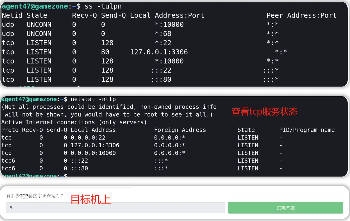 我们默认已经使用ssh连接到目标机器,所以可以通过ssh界面在目标机上运行ss -tulpn命令
